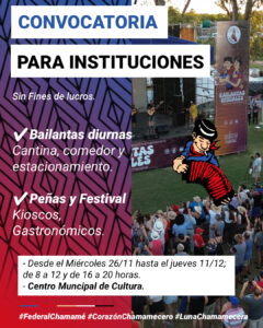 La Comisión Central del Festival Nacional del Chamamé invita a las instituciones de la comunidad a presentar solicitudes para la comercialización de los siguientes espacios:✔ Bailantas diurnasCantina, Comedor, Estacionamiento✔ Peñas y FestivalKioscos, gastronómicos📍 Presentaciones en la Casa de la Cultura🕗 Horarios: 8 a 12 y 16 a 20 hora